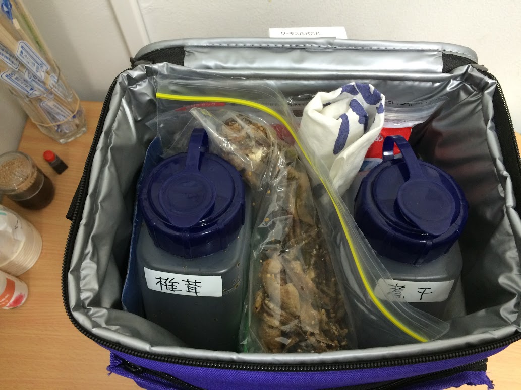作ったつゆがそれぞれ1.5リットルぐらい、保冷剤と煮物とか詰めてたら結構な重さ5kgじゃきかない。