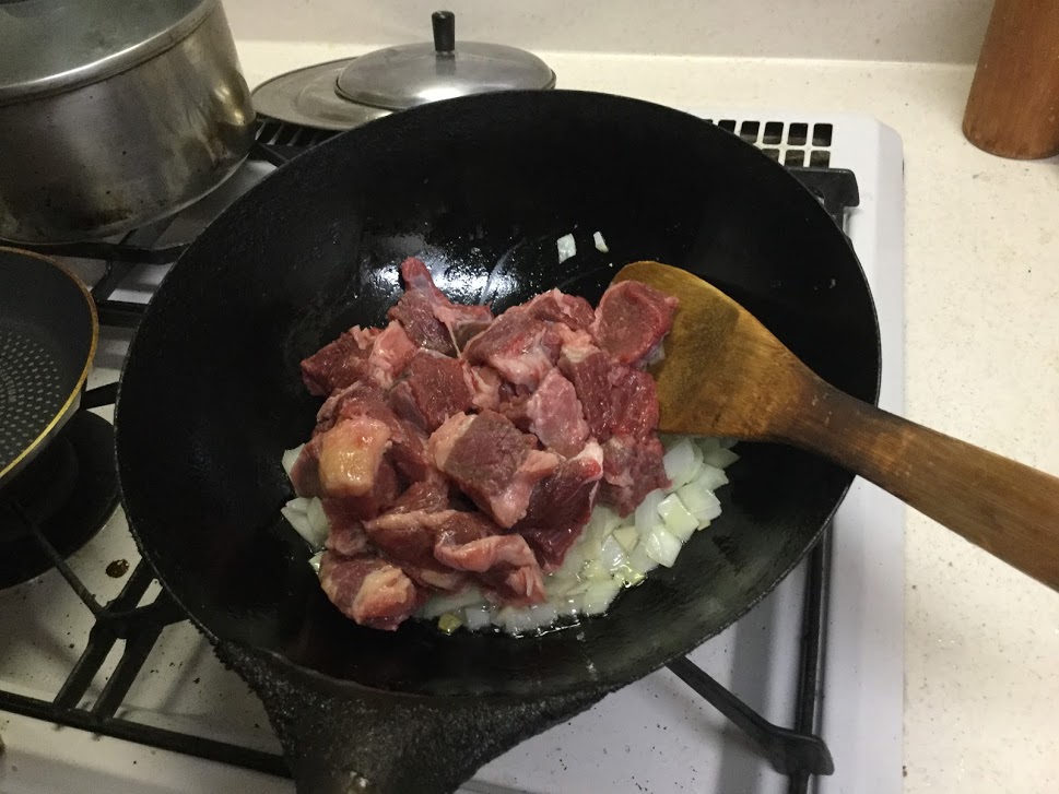 材料は牛スネ肉、マッシュルーム、たけのこ、ココナッツミルク。インドネシアはイスラムが多いから牛肉にしてみました。