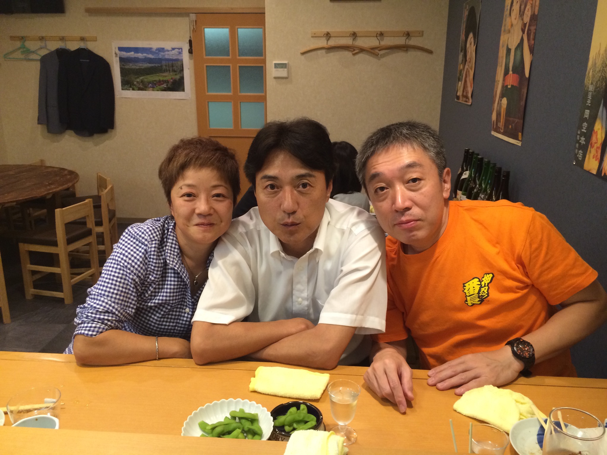 このタイミングで東京からひーちゃん合流、大学時代の友人アキラと3名で八幡にある「どん兵衛」というお店に行きました。お店のご主人の決めた順番で次々に日本酒が出てきます。